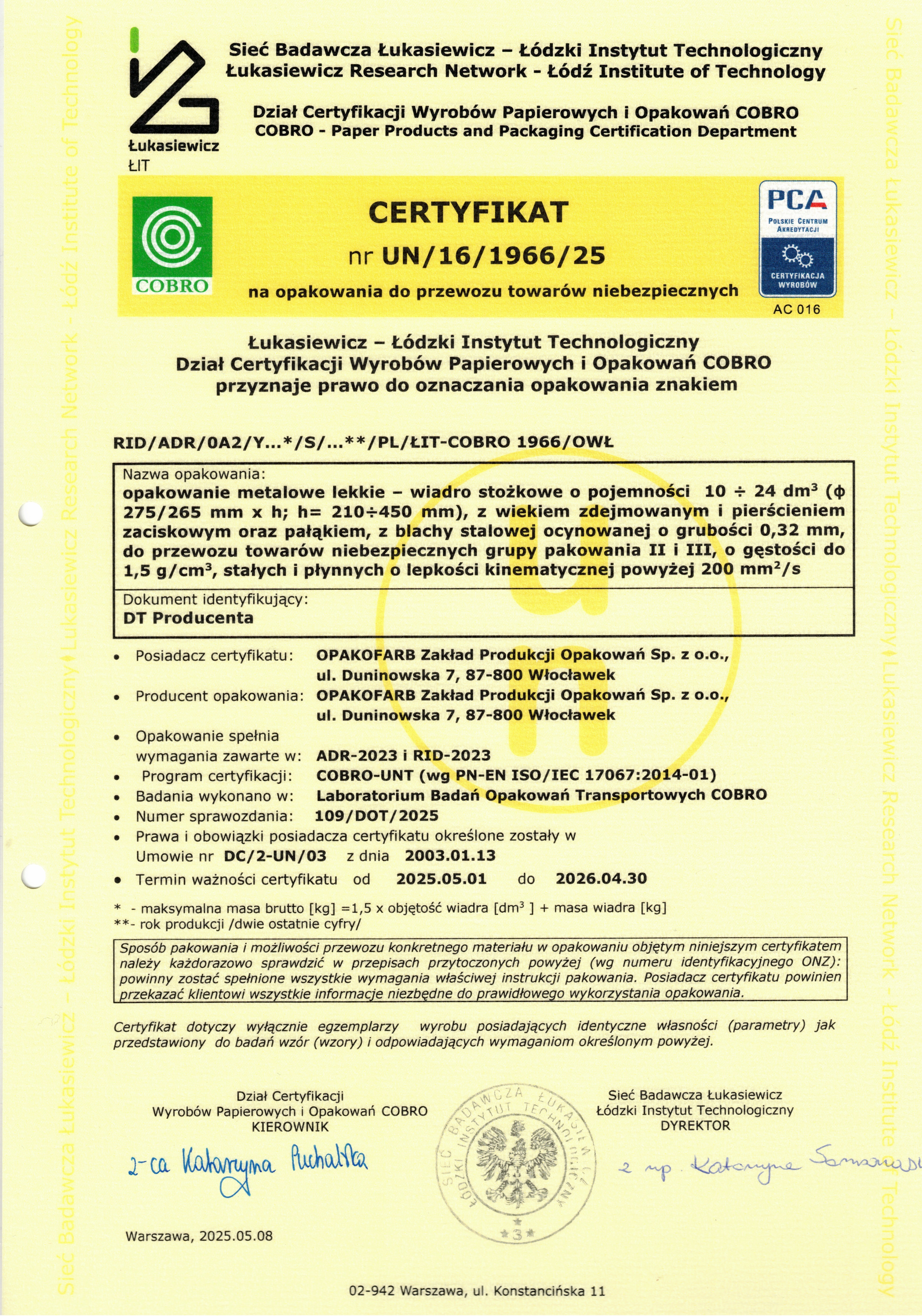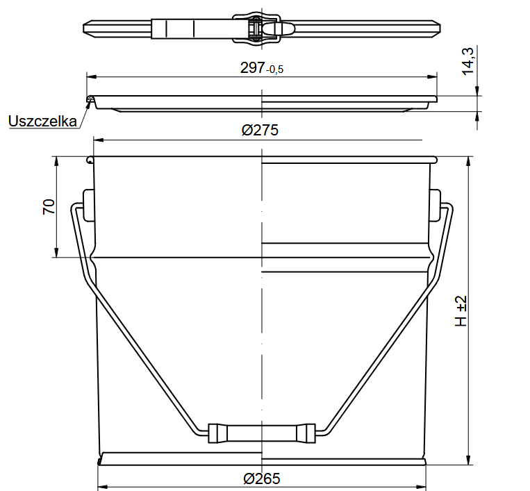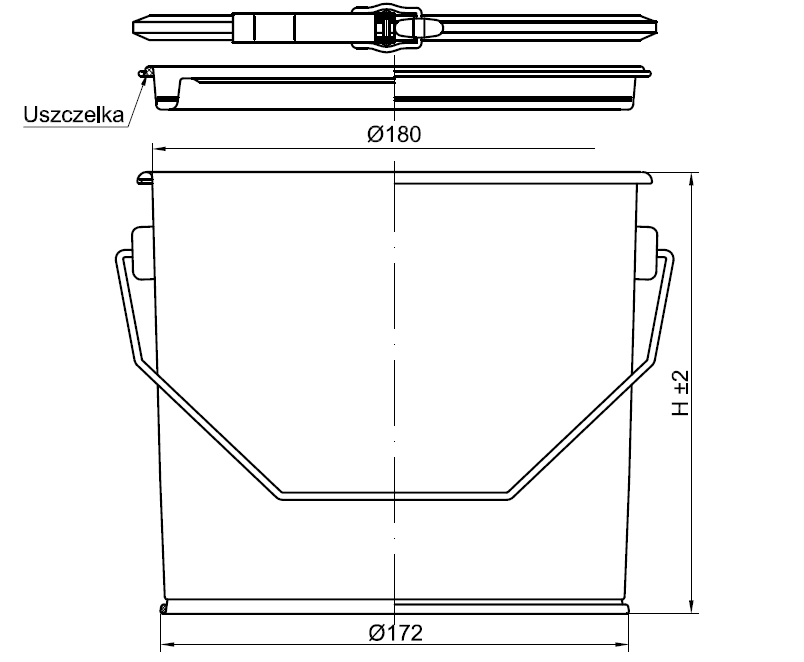 Wiadro wykonane jest z blachy ocynowanej. Zamknięte wiekiem nakładanym, połączonym z pobocznicą pierścieniem z zaciskiem dźwigniowym zabezpieczonym przed otwarciem plombą. Uszczelnienie wieka wykonane jest z masy uszczelniającej. Zawalcowanie dna z pobocznicą uszczelnione jest uszczelką z masy uszczelniającej. Dla wiader o pojemności od 2,5 l do 7,0 l kabłąk wykonany jest z drutu ocynkowanego Ø 2,7 mm; dla wiader o pojemności od 10,0 l do 20,0 l kabłąk wykonany jest z drutu ocynkowanego Ø 3,9 mm z uchwytem z tworzywa sztucznego. Na życzenie zamawiającego wiadra o pojemności 2,5L - 5L oraz 10L -12L mogą być wykonane w wersji z przetłoczeniem pobocznicy lub bez przetłoczenia pobocznicy. Wiadro może posiadać zabezpieczenie powierzchni pod wyroby wodorozcieńczalne. Wszystkie typy wiader mogą mieć wytłoczony na pobocznicy trójkąt - znak ostrzegawczy przed substancjami niebezpiecznymi.